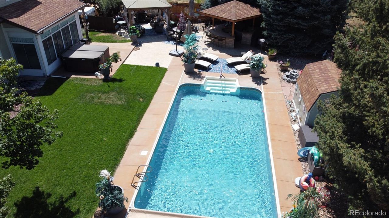 Great Location within walking distance to Downtown Parker. This exceptional home offers a combination of a truly functional open concept living and a large lot with outstanding outdoor living. The professionally landscaped backyard is the dream for entertaining. Inground pool, hot tub, covered cabana sit up bar/gas grill/sink/frig. Separate covered area with wood burning fireplace on stamped concrete. Separate Trex deck overlooking pool and pickleball/cement sport court. Fully new fenced entire yard. Separate Dog kennel area also used for parking small campers. All backing to private open space. Large Evergreen two story trees. Inside the home features a living room with French doors, office with French doors, large, vaulted family room with wood burning fireplace, wood featured wall floor ceiling. Large windows with plantation shutters. Eat in area kitchen with tons of cabinets and two pantries. Main floor laundry room with washer and dryer included. Mudd room coming in from garage and backdoor to dog kennel/camper parking/trash cans. Custom French doors out to sunroom. Newer Windows. Entire First floor is Tiled and heated tile in Family room. Half Bath finishes the first floor. Second floor consist of Primary bedroom vaulted with one closet, Primary 3/4 bathroom with large walk-in shower with custom seamless glass, double sink vanity, sky light, Walkin closet, tiled floors. Three more bedrooms and a remodeled full bathroom. Basement is finished with large rec room, bar, and half bath. Large storage room/mechanical, two crawl spaces, one of them fully cemented. Three car garage and single car have two custom garage doors that open for full pull through for camper storage. Metal storage cabinets in main garage. Three lane driveway. Mature landscaping. Brand New roof 2026, Ext/Int Paint. Newer HVAC Systems/water heater. Walking distance to Elementary School. Tons of walking/biking trails. Come enjoy what the Town of Parker has to offer.